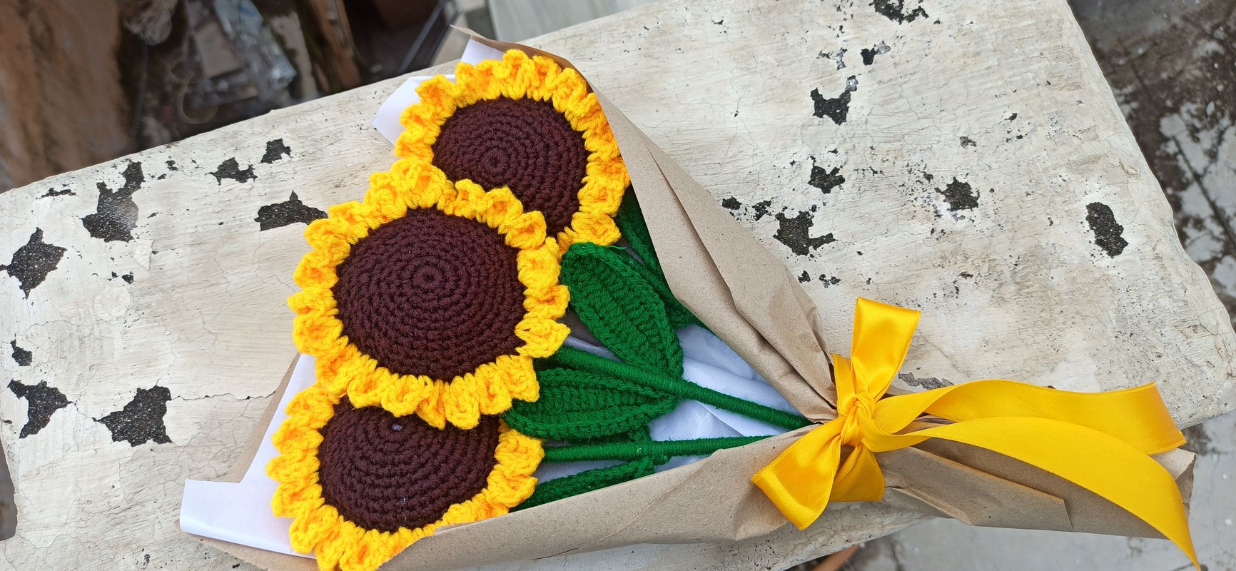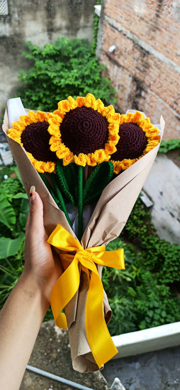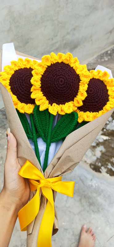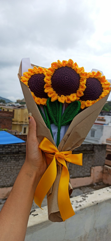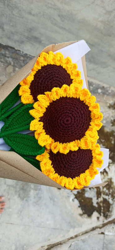Handmade crochet Sunflowers Bouquet 🌞Handmade with love!Each flower length – 20cmQty- Three SunflowerPack in a secure box Dm for more details & customisation!